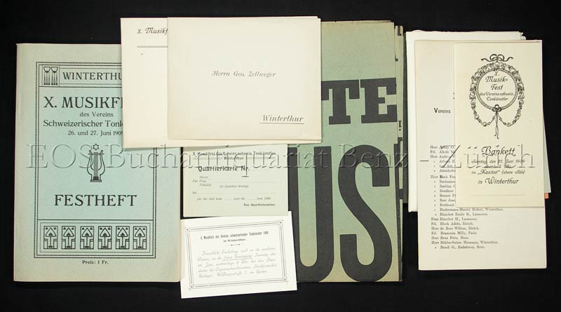 Beiliegend: 1 gef. Plakat, 2 Quartierkarten, Einladungskarte für die „Freie Vereinigung“, 3 Bankettkarten, 13 Konzertkarten (in beschr. Briefumschlag an Herrn Geo. Zellweger), 1 Präsenzliste, div. Prospekt der Veranstaltungen und 1 Führer durch Winterthur, herausgegeben vom Verkehrs- und Verschönerungsverein. Alles in Orig.-Briefumschlag des Musikfestes. – Umschlag beschädigt, das Plakat kintterfaltig, das restliche Material ungebraucht.