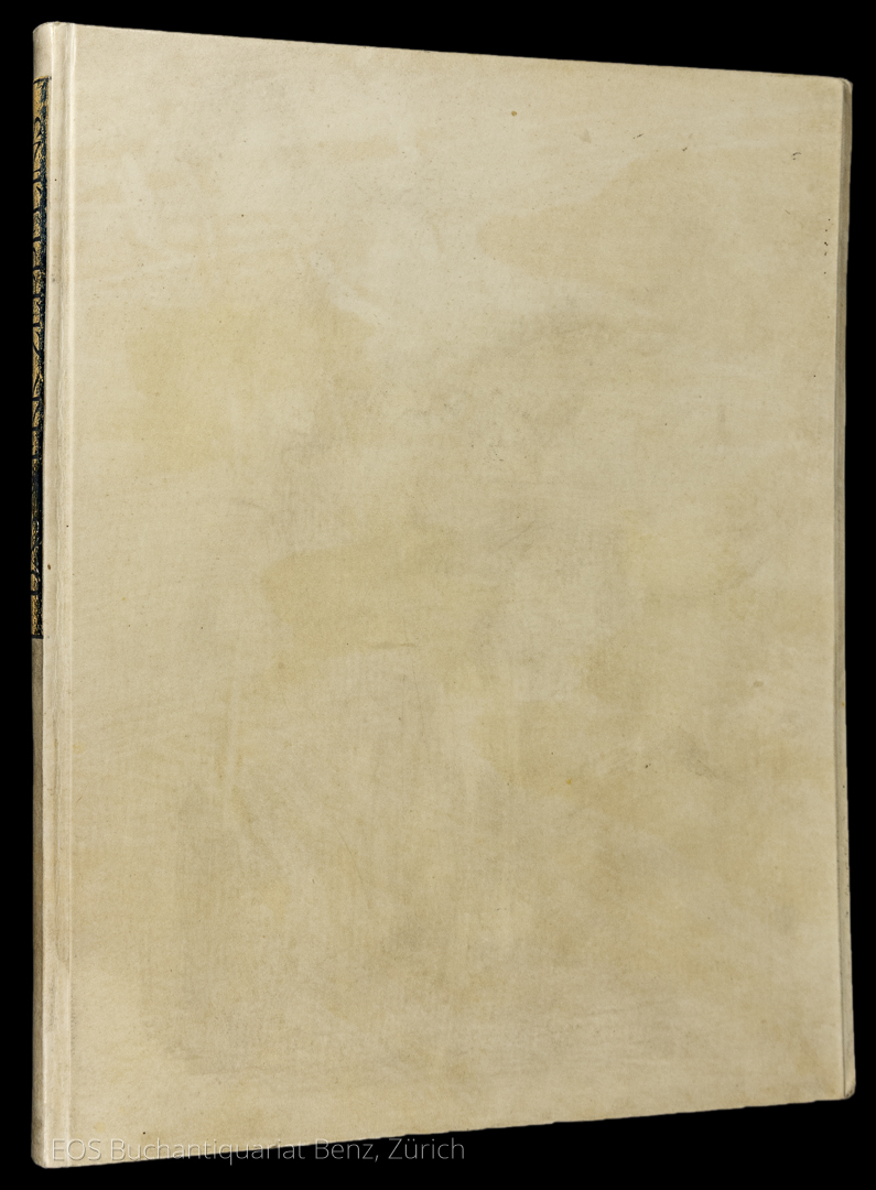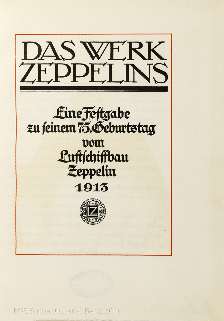 Zeppelin, Ferdinand von: Das Werk Zeppelins. Eine Festgabe zu seinem 75. Geburtstag vom Luftschiffbau Zeppelin 1913. Stuttgart, Kommissionsverlag von Julius Hoffmann, 1913, 4°. 98 S. Mit radiertem Portät, 5 Tafeln (Photogravuren von Bruckmann) und zahlr. Illustrationen im Text. Pergamentband der Zeit mit Leder-Rückenschild.