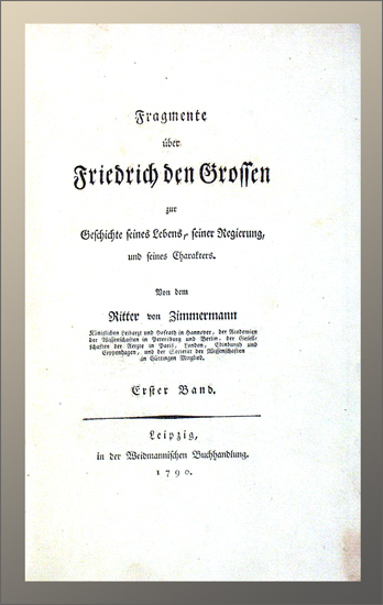 Zimmermann, Johann Georg: Fragmente über Friedrich den Grossen zur Geschichte seines Lebens, seiner Regierung und seines Charakters. Leipzig, Weidmann, 1790. 3 Bände. Gr.-8°. VIII, 324 S.; VI, 314 S.; IV, 372 S. Halblederbände der Zeit mit blindgeprägten Rückenschildern.