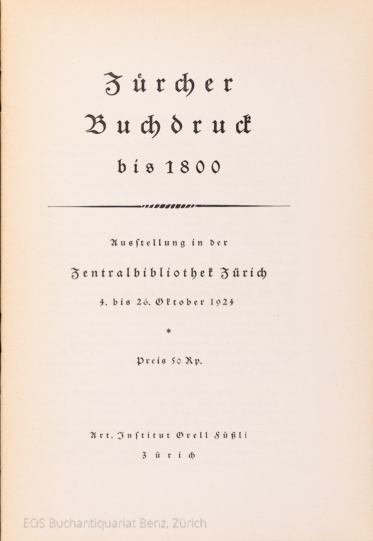 Zürcher Buchdruck bis 1800. Ausstellung der Zentralbibliothek Zürich, 4. bis 26. Okt. 1924 : [Katalog]. Zürich, Orell Füssli, 1924. 8′. 27 S. Broschur.