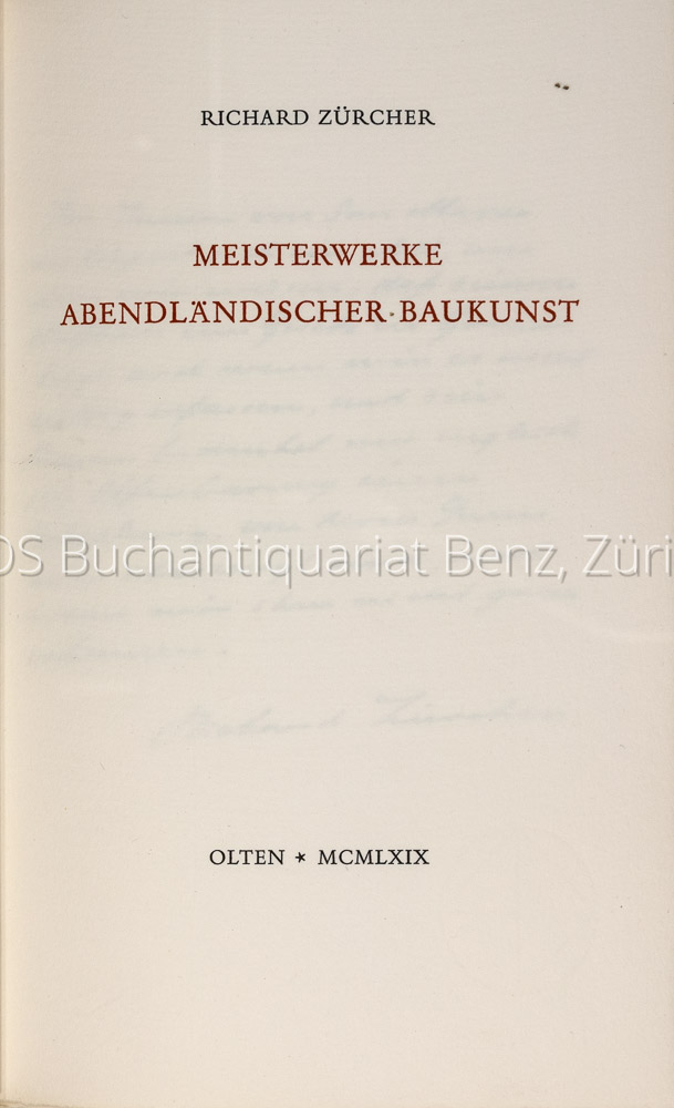 Zürcher, Richhard: Meisterwerke Abendländischer Baukunst. Olten, Vereinigung Oltener Bücherfreunde, 1969. 8°. (3) Bl., 65 (3) S., (3) Bl. Blindgeprägter grüner Maroquinband mit Kopfgoldschnitt in Schuber von Hugo Peller.