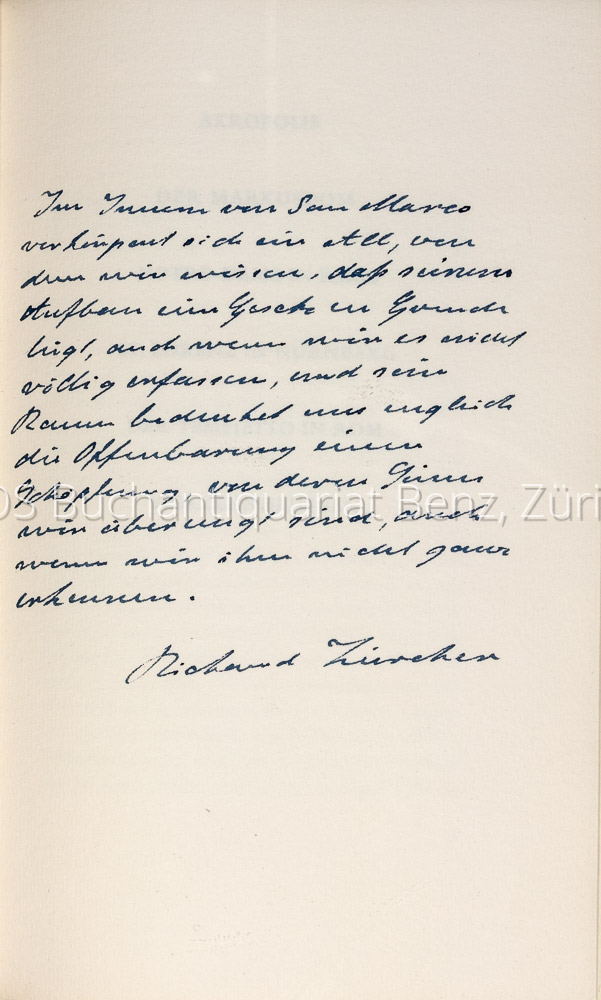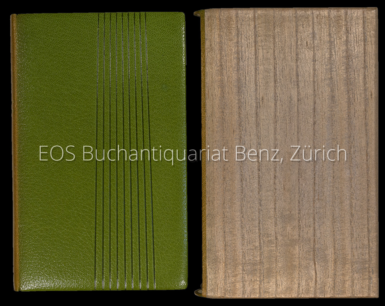 Nr. VII von 36 Exemplaren der Vorzugsausgabe auf Zerkallbütten in Maroquineinband. Gesamtauflage 571 Exemplare. Mit 12-zeiligem handschr. Eintrag von Richard Zürcher. – Aus der Reihe: „Vereinigung Oltener Bücherfreunde“, 20. Publikation. – Einbandrücken verblichen und mit drei kleinen Fleckchen.
